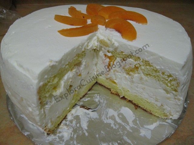 Above, we place the other layer of the sponge cake, and we put it in the fridge for a few hours (preferably put in the fridge overnight). After about 4 hours (or in the morning), we remove the cake out of the pan and we place it on a platter, and we decorate it with 250 ml whipped cream (sweetened with some powdered sugar if you like) and fruits as you like, I've decorated it very simple this time with some apricot slices.