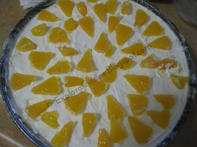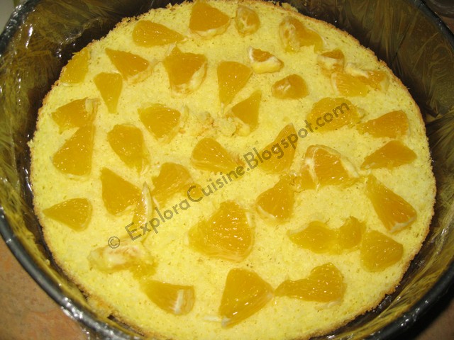 Dress cake pan with cling film (to be take the cake out easily) and place one layer of the sponge cake into the pan and moisten it a little bit with pineapple juice from the can. Cut mandarins in smaller pieces (previously drained of juice), and place some on top of the cake layer.