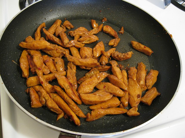 We remove the chicken from the fridge and drain the sauce. We fry the chicken strips in a pan with some vegetable oil until it's golden brown.
