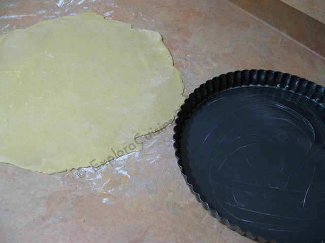 Scoatem aluatul din frigider dupa 1 ora si il intindem in mod egal cu sucitorul pe blatul infainat pana e mai mare ca si forma si ungem forma de tarta cu unt.